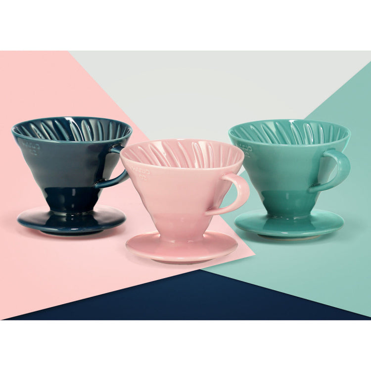 These special edition V60 02 ceramic drippers from Hario offer all the same benefits of the standard ceramic V60s. Namely the perfect shape for pour over brewing and fantastic heat retention. The difference is these special edition drippers are available in a new range of stand-out colours, sure to catch the eye on any countertop Product features • Brand: Hario • Range: V60 • Material: ceramic • Colour: turquoise • Size: 02 • Brews: 1-4 cups • Filters: V60 paper filters, size 02 (not included) • Filter lifespan: single use • Also available: matte black, indigo blue, pink, matte white (special edition); red, white (standard) • Also available: Replacement filter papers (bleached or unbleached, x40 or x100)