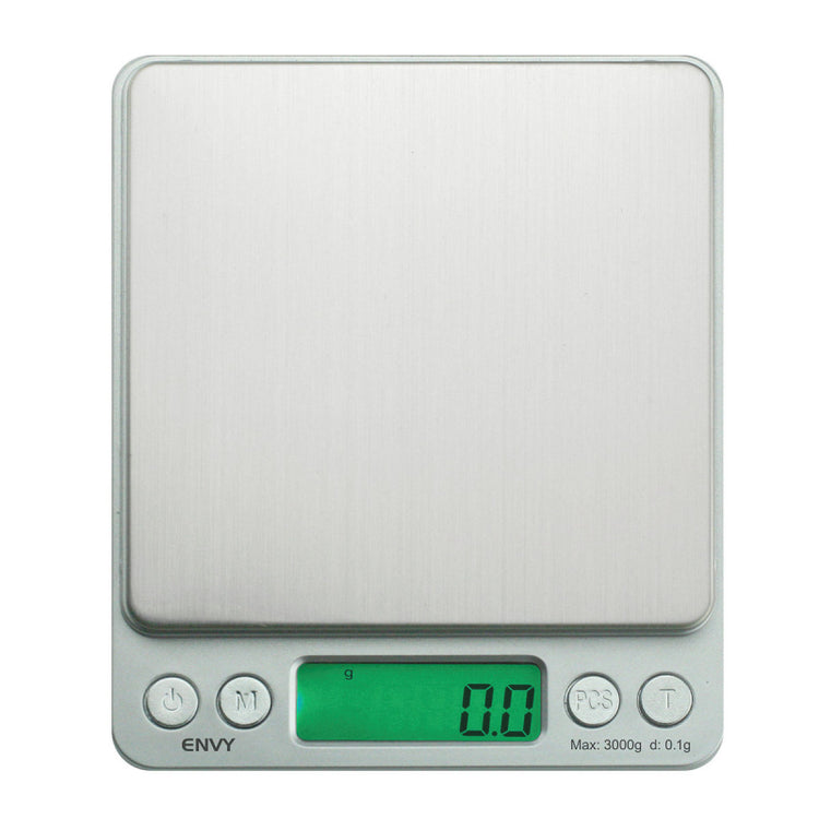 Product update: As of June 2020 the Envy Series Miniscale now features a capcity of 3,000g, rather than 2000g. Large stainless steel platform, four easy to use function buttons and a green backlit display for a clearer view. Supplied with two large weighing trays, acting as both a lid and a protective layer for the Scale Product features • Range: Envy Series • Capacity: 3000g with overload protection • Accuracy: 0.1g • Units of Measure: G/OZ/OZT/DWT/CT/GN • Platform build: stainless steel with two large detachable lids/trays • Platform size: 100 x 100mm • Colour: silver • Key functions: Auto-Off (180 seconds), Tare/Cal • Display: LCD with green backlight • Power: 2 AAA batteries (included) • Warranty: 3 years