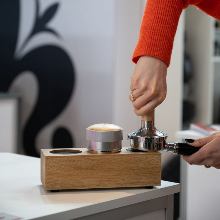 Compact and solid, the Tamping Station Double looks great and improves workflow. Available in walnut or oak. COMPLETE. Thanks to the double housing, allowing the user to rest both tamper and leveller. STABLE. Thanks to the removable rubber support that ensures stable positioning of the filter holder. TAMPER AND LEVELLER FRIENDLY. Tamper and leveller housing, perfectly compatible with Eureka tampers. PREMIUM QUALITY AND FINISH. Thanks to refined materials and details, with the engraved Eureka logo on the side. MATERIALS & DIMENSIONS Wood (walnut or natural oak) and rubber support, cover and feet. Dimensions: W84 x D213 x H60 mm