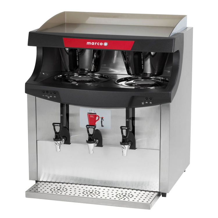 Highly convenient boiler and brewer combo, ideal for high volume catering locations including hotels, restaurants and conferences • Two coffee urns • Half and full brew feature • Separate coffee and hot water taps • See downloads below for full spec details MARCO PN: 1000495